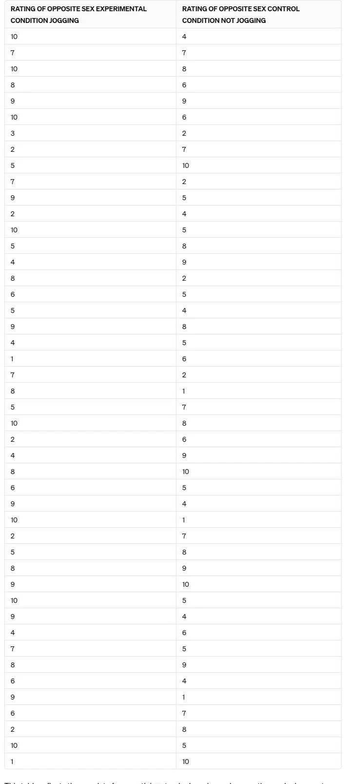 In the following example, Participants rated photographs of the opposite sex on a scale of attractiveness from 1 to 10. Participants were randomly divided into two groups (independent group design). One group jogged on the spot for ten minutes while the other half performed the ratings without exercise. It was hypothesised that physical activity would increase ratings of attractiveness.